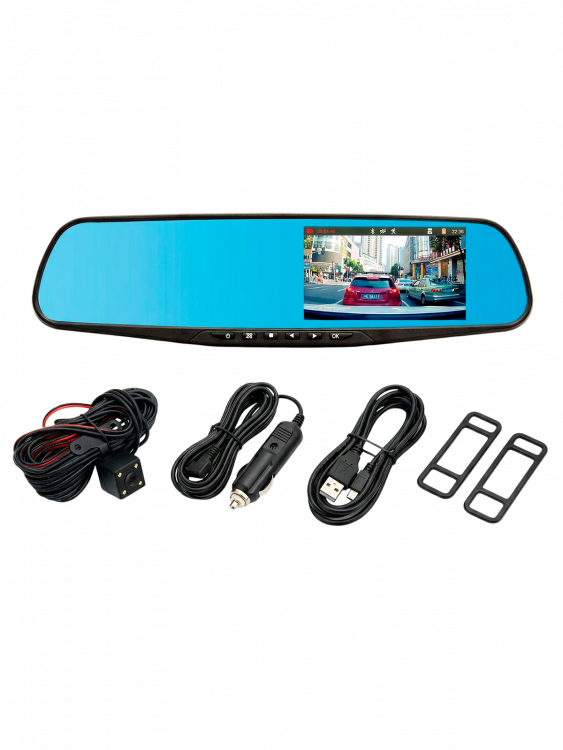 | видеорегистратор, кабель питания 1.5м, камера заднего вида, крепление на зеркало, инструкция на Русском |