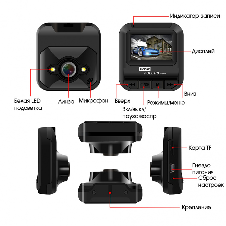 Прочие функции: автостарт записи при включении питания / Подсветка 2 светодиода (вкл/выкл кнопкой)