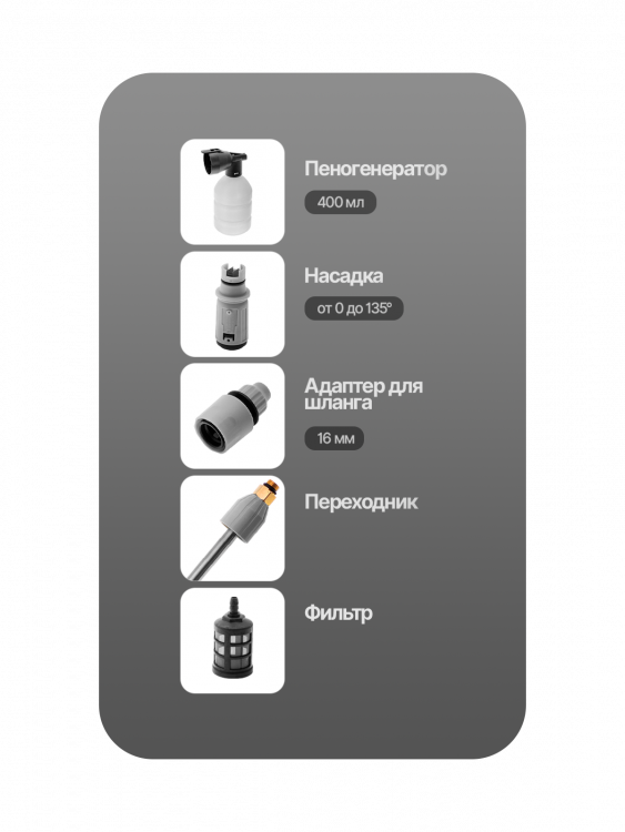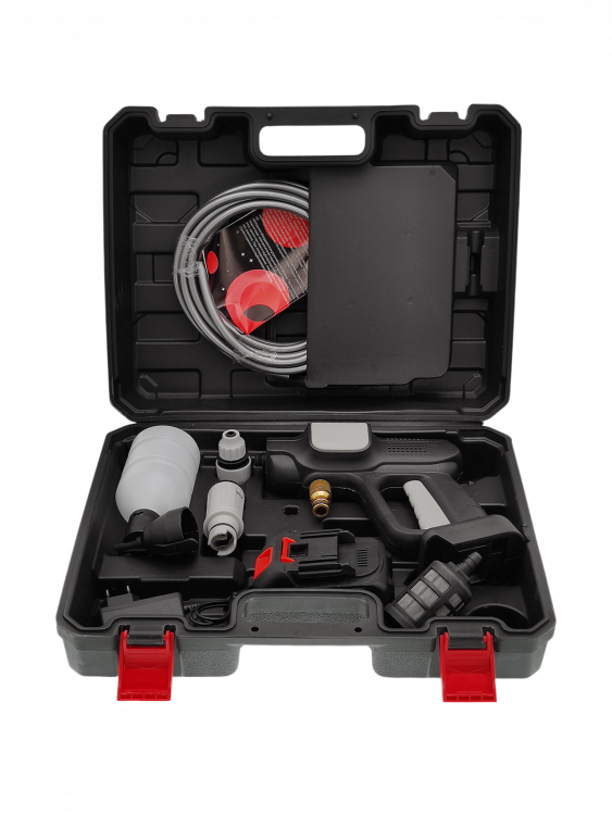 Качественный насос высокого давления для мойки обеспечивает надежную подачу воды, что значительно ускоряет процесс очистки. Опрыскиватель для автомобиля позволяет равномерно распределить моющее средство по поверхности, обеспечивая качественный результат. Пистолет для мойки высокого давления обладает удобной рукояткой и легко управляется одной рукой.