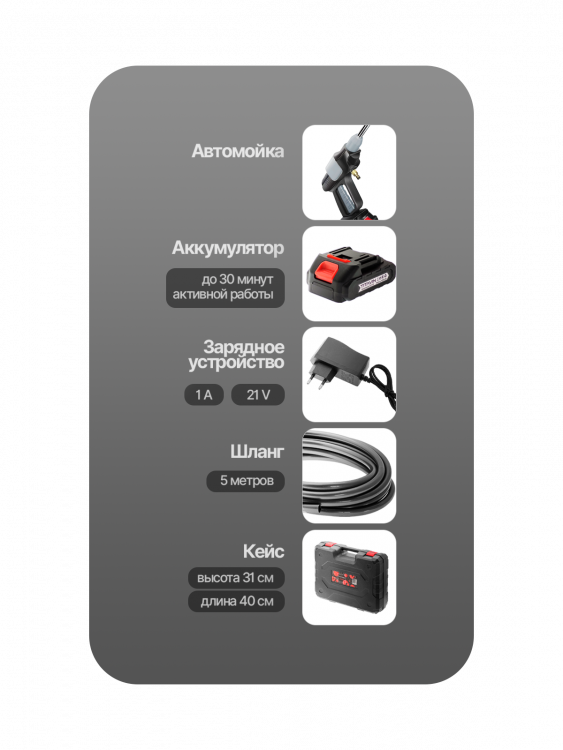 Мини мойка аккумуляторная высокого давления идеально подходит для тех, кто ценит мобильность и практичность. Устройство может работать без подключения к электросети, что позволяет использовать его как на даче, так и в городских условиях, что сделает процесс мойки еще более комфортным и эффективным.