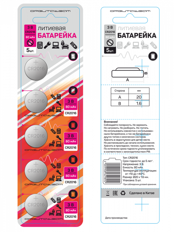 Батарейка таблетка круглая CR2016, Li (литиевая), 80 мАч, 5 шт Орбита
