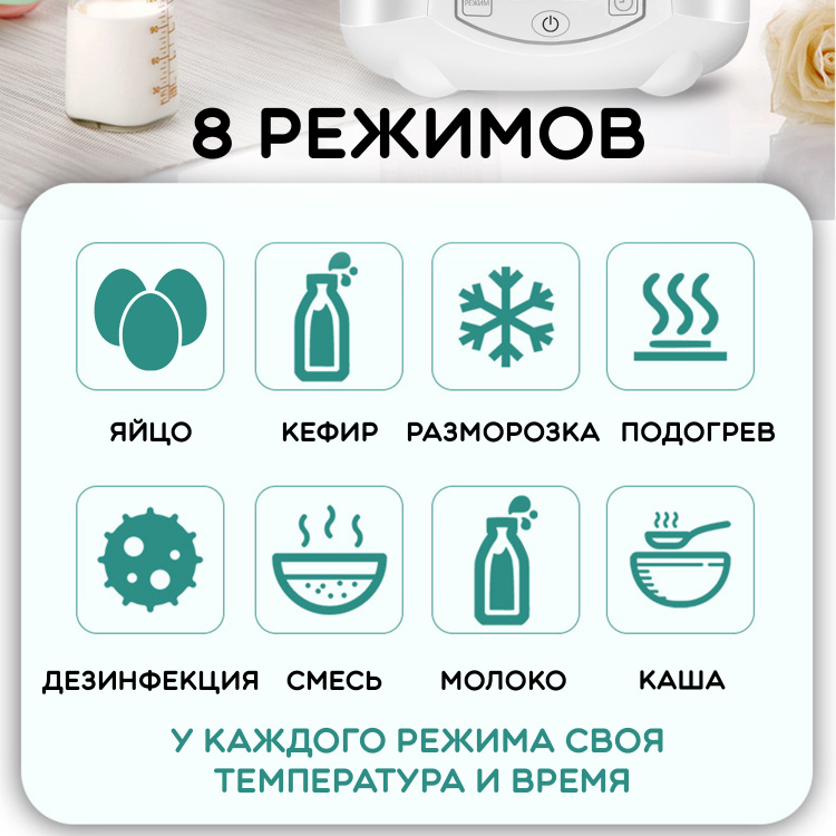Размораживание продуктов / Разогревание продуктов / Приготовление яиц / Стерилизация бутылочек / Приготовление каши