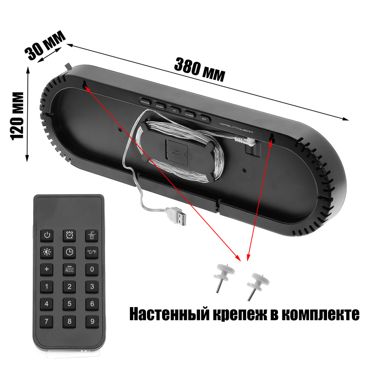 | часы, крепление на стену, пульт ДУ, кабель питания USB 3м, батарейка CR2032, инструкция на Английском |