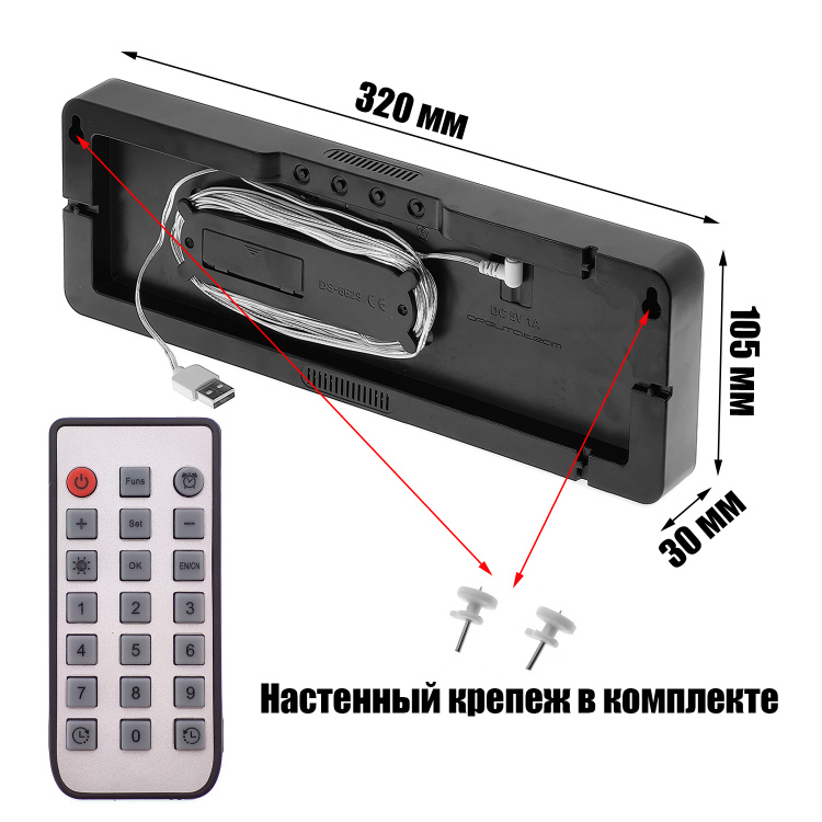 | часы, крепление на стену, пульт ДУ, кабель питания USB 3м, инструкция на Английском |