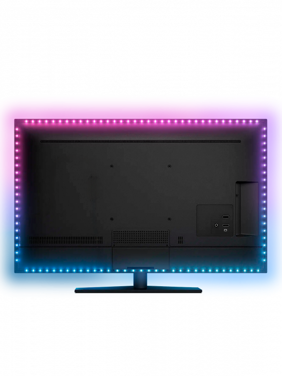 Установка подсветки предельно проста — устройство питается от обычного USB 5В, 1А, поэтому его можно подключить непосредственно к вашему телевизору. Это делает монтаж максимально удобным: без лишних проводов, адаптеров или сложных настроек. Лента легко приклеивается по периметру ТВ диагональю 55–65 дюймов, обеспечивая идеальное распределение света без затемнений и пробелов.