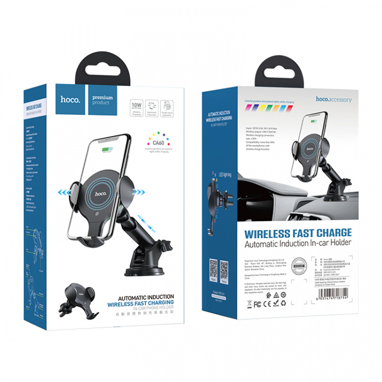 HOCO CA60 Черный Держатель для смартфонов + беспроводное ЗУ 10W (присоска, воздуховод)