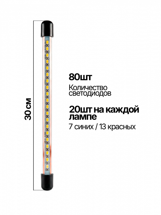 Количество светодиодов 80шт: 20шт на каждой лампе (7 синих / 13 красных)