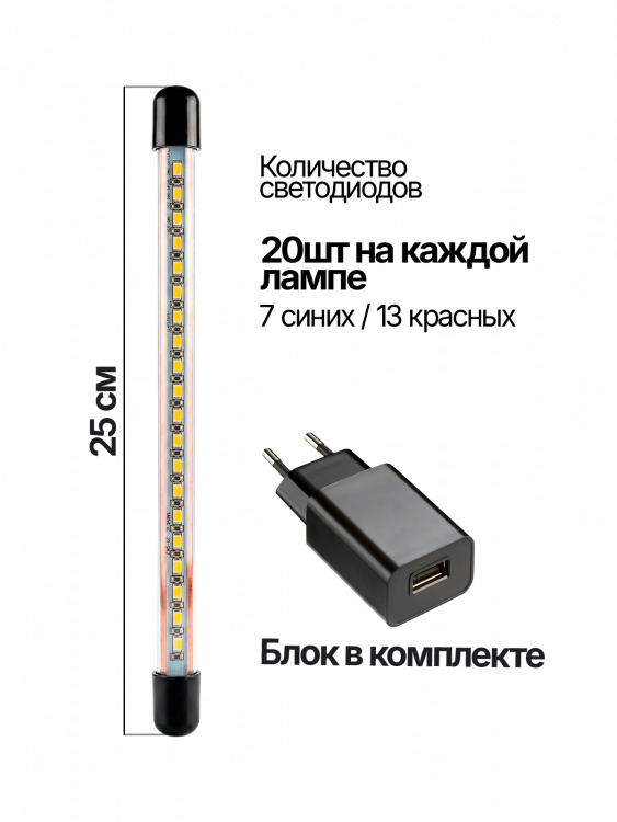 | фитолампа, блок питания USB 5В/2А, инструкция на Русском |