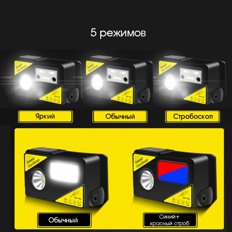Режимы свечения: 5 - яркий, обычный, стробоскоп, белый, красный + синий стробоскоп