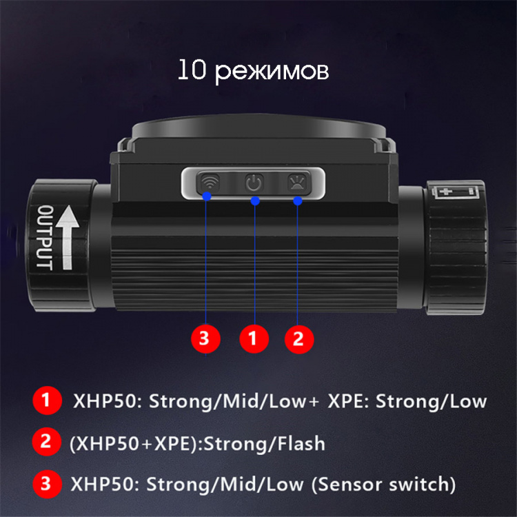 Режимы свечения: 10 - 2*яркий, 2*обычный, 2*эконом, 3*при сенсорном режиме