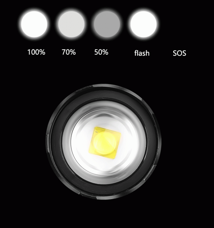 Прочие функции: сигнальный фонарь, индикация заряда аккумулятора, фокусировка луча, выход USB 5В/1А