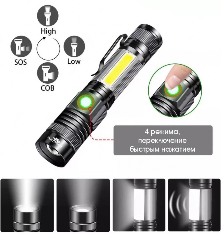 Режимы свечения: 4 - яркий, 2*обычный, SOS