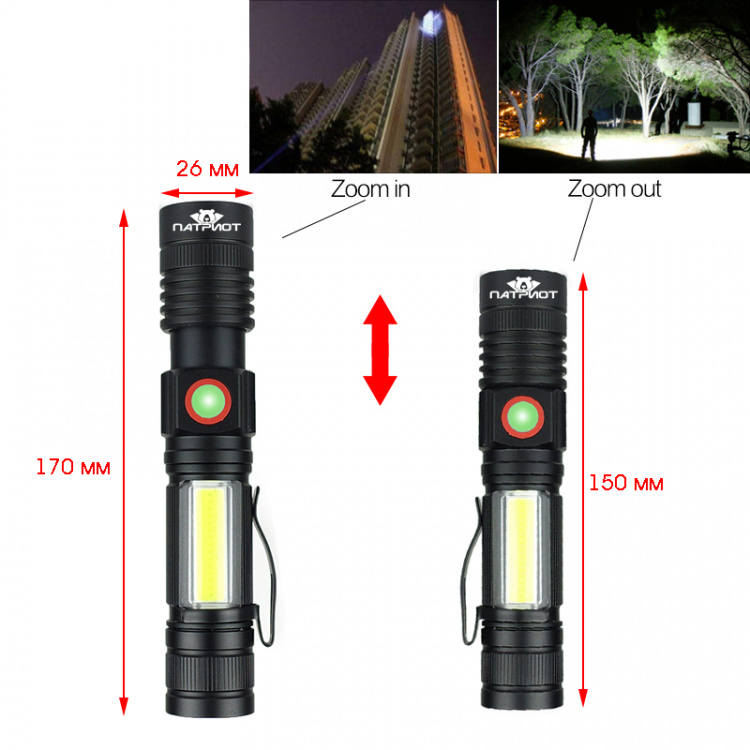 Патриот PT-FLR38 Черный фонарь ручной (1L, 18650.,ZOOM)