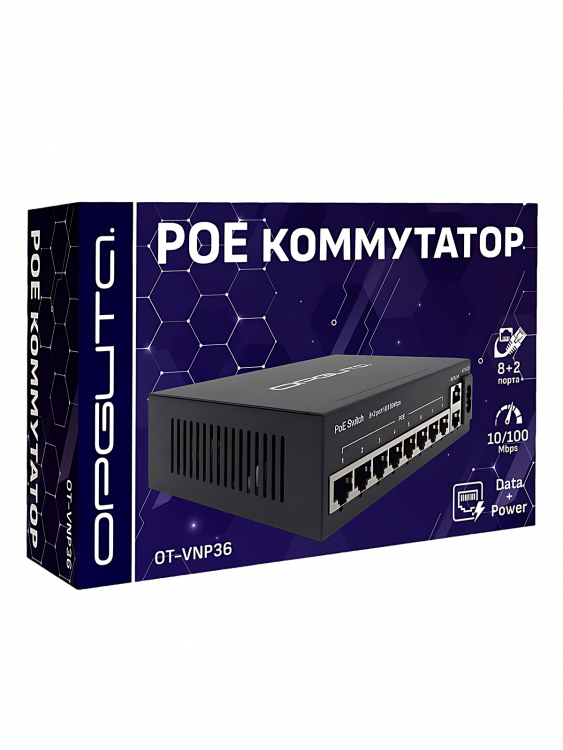 Коммутатор (свитч) на 8 POE ( 802.3af/at ) портов +2 Ethernet порта 100Mbs Орбита OT-VNP36