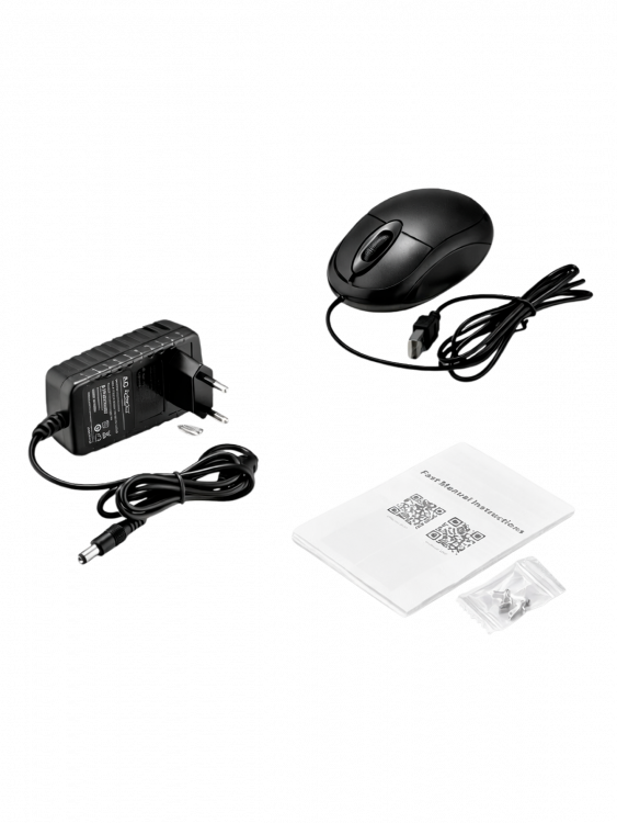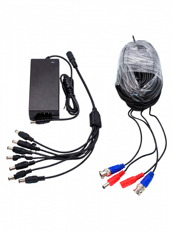 | регистратор, камеры-8шт, кабеля-8шт(18,3м), блок питания (12В/2А/4А)-2шт, мышка |