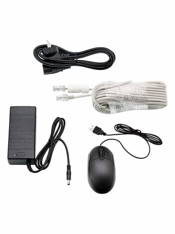 | регистратор, камеры-4шт, кабеля-4шт (18.3м), блок питания (48В/1.5А), мышка |