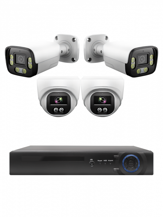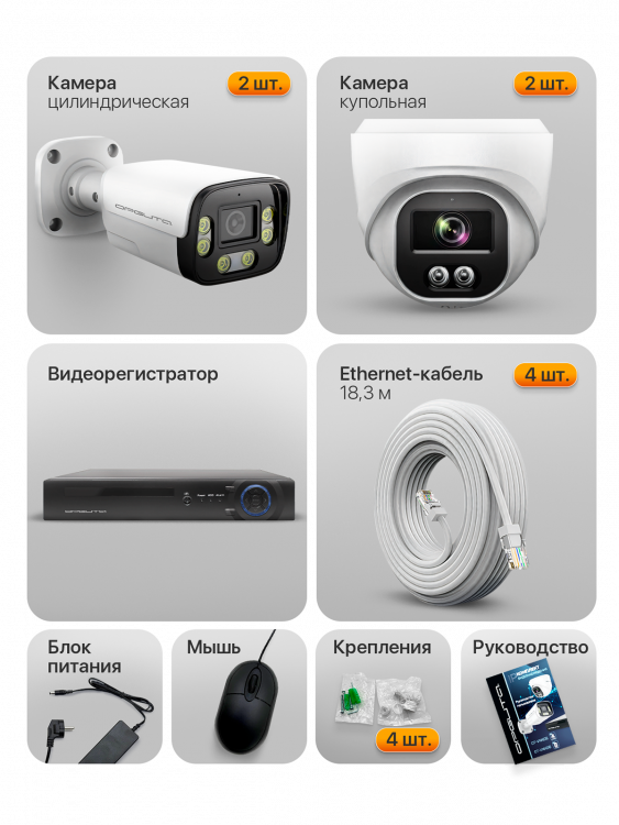 | Видеорегистратор 1шт, купольная IP камера 2шт, цилиндрическая IP камера 2шт, крепление для камеры 4шт, интернет-кабеля (18.3м) в бухте 4шт, блок питания 1шт (52В/1.25А), мышь 1шт, инструкция 1шт. |