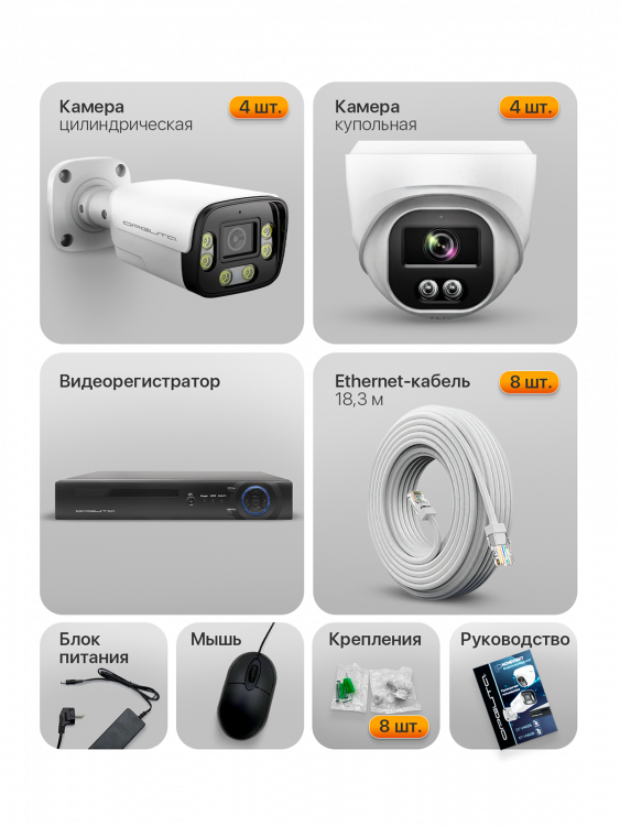 | Видеорегистратор 1шт, купольная IP камера 4шт, цилиндрическая IP камера 4шт, крепление для камеры 8шт, интернет-кабеля (18.3м) в бухте 8шт, блок питания 1шт (52В/2.3А), мышь 1шт, инструкция 1шт. |