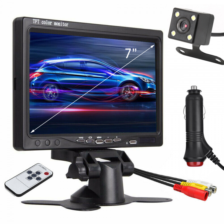 | монитор, кабель питание 5.5м, пульт ДУ, камера, ЗУ в прикуриватель 1.5м, инструкция на Английском |