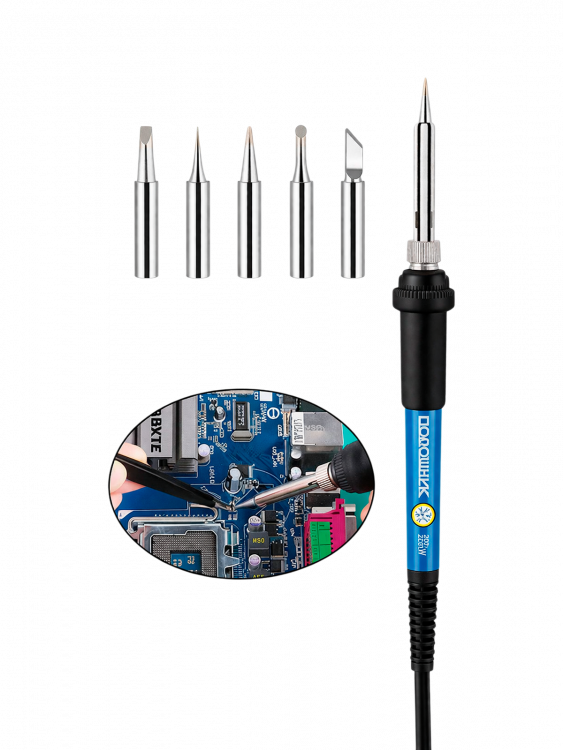 3) Паяльник с терморегулятором: 60Вт / 220В / Диапазон температур: 200 ~ 450℃ / Наконечники паяльника: 900M-B1.2 / Длина провода: 1.5м