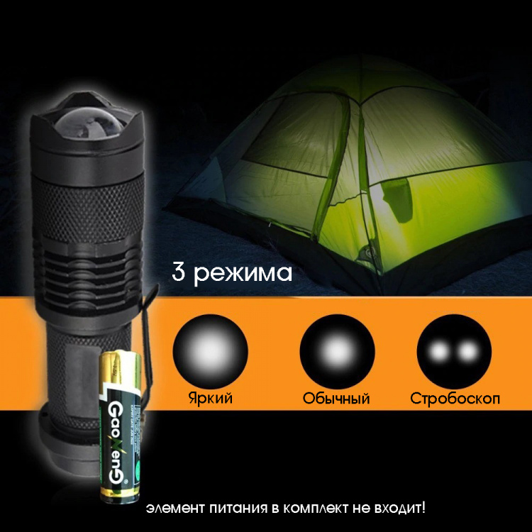 2) Фонарик (3 режима, питание АА-в комплект не входит)