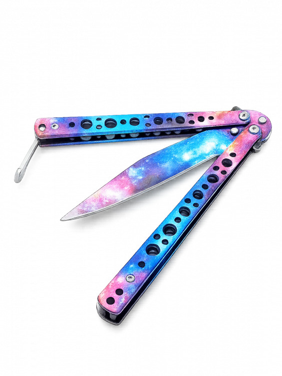 Нож-бабочка складной имеет разноцветную ручку, которая добавляет ему эстетической привлекательности