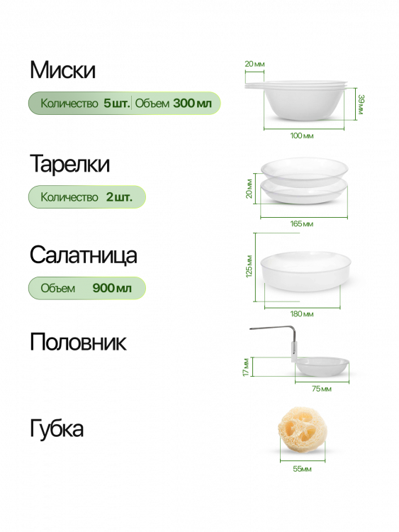 Лопатка, салатница, тарелки 2шт, половник, губка для мытья, миска 5шт, набор ложка/вилка/нож 4шт