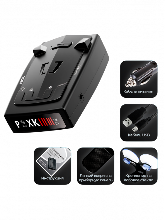 | Радар детектор, нескользящий коврик на панель, кабель для обновления баз данных, кабель питания в прикуриватель 1.1м, инструкция на Русском языке |