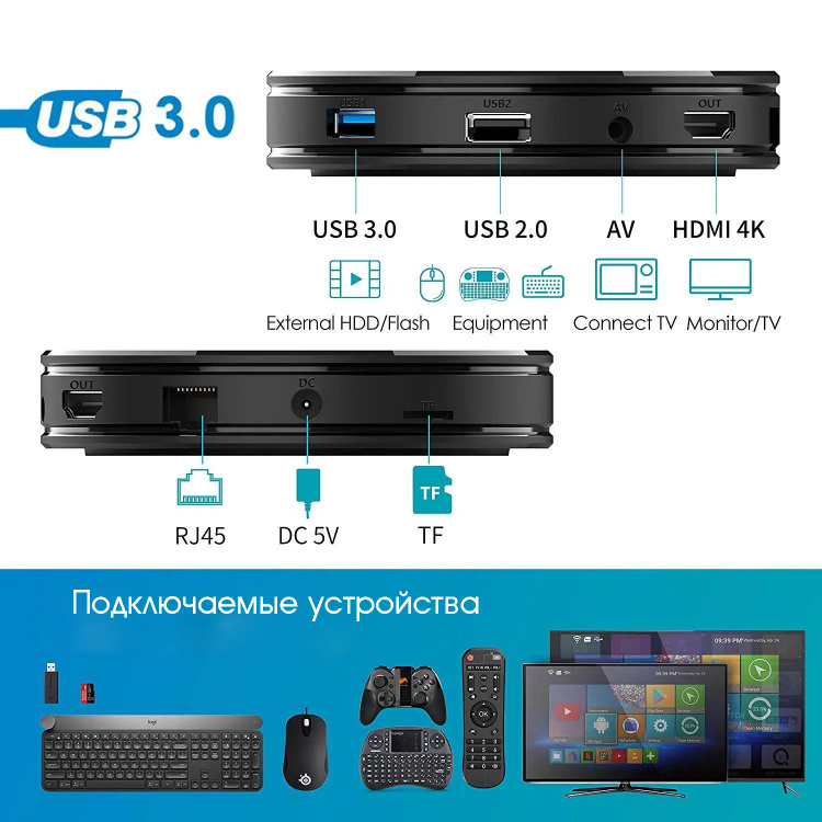 Интерфейс: AV,Порт питания DC,HDMI, TF до 64Гб,RJ45,USB2.0 - 1шт, USB3.0 - 1шт