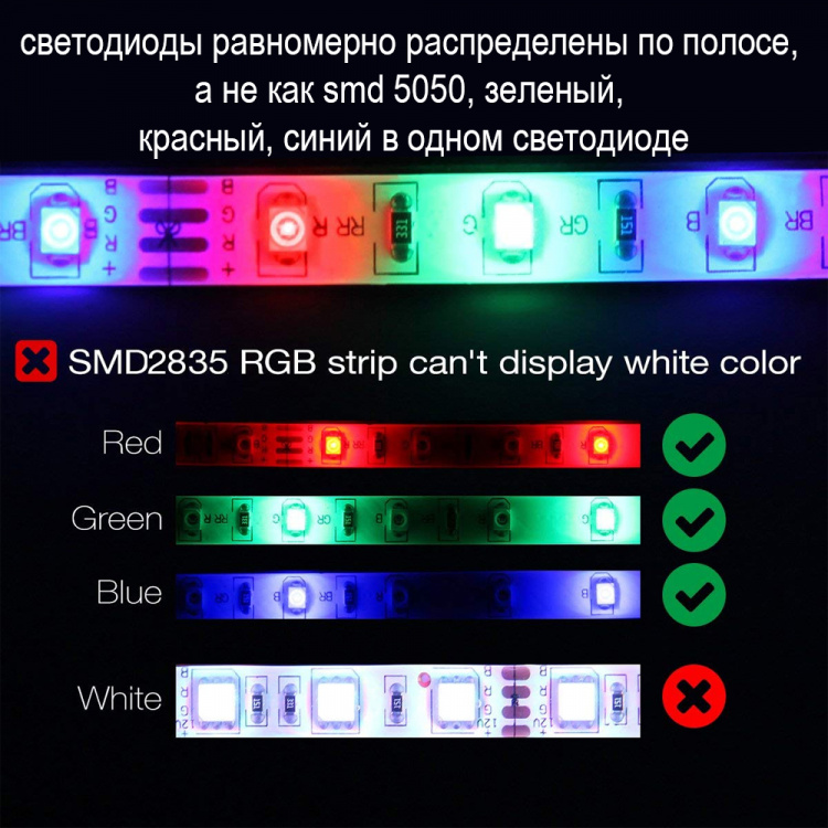1) лента SMD 2835 (светодиоды расположены друг за другом красный/зеленый/синий не RGB светодиоды) длиной 1 метр, 60 диодов общей мощностью 6Вт (720 lum), степень защиты IP20, с клеевым слоем из двустороннего скотча,