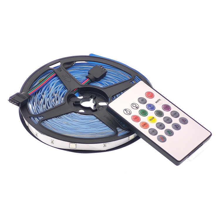 1) Лента 5050 RGB длиной 5 метров, 18 светодиодов на 1 метр (яркость одного диода 8lum), степень защиты IP20, с клеевым слоем из двустороннего скотча