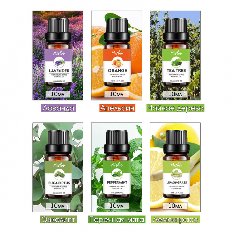 Включает в себя 6 отдельных флаконов по 10 мл эфирных масел: