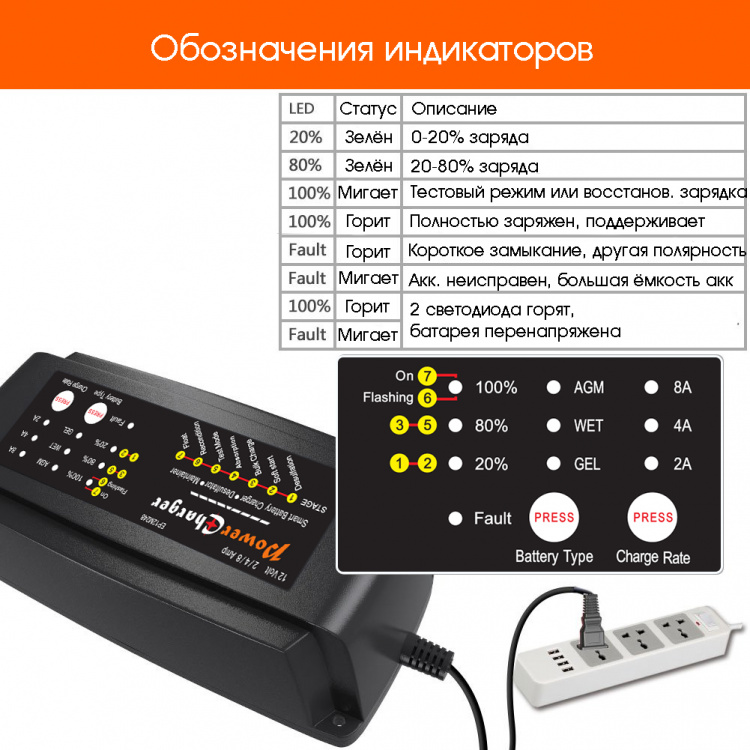 | Типоразмер заряжаемых аккумуляторов | SLA/GEL/AGM/VRLA |