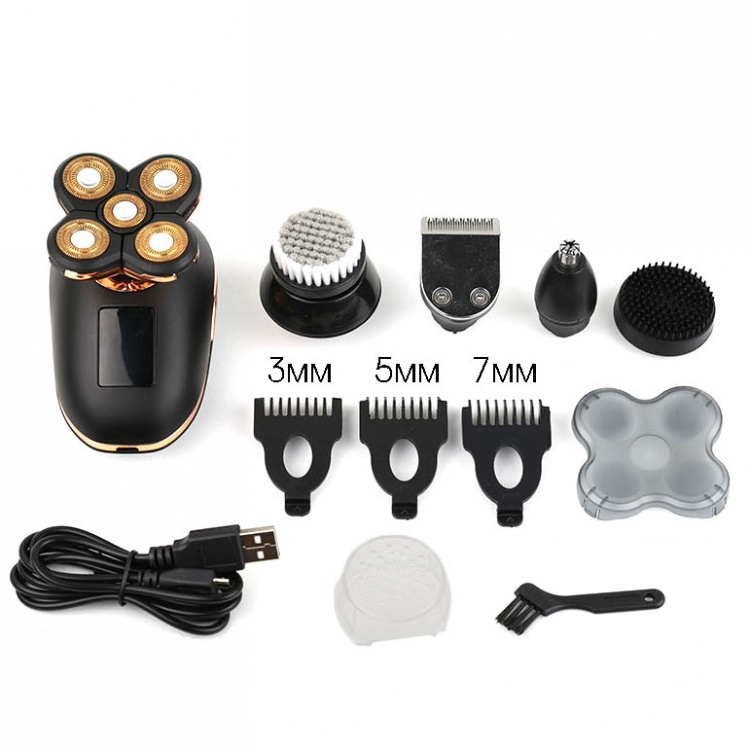 В комплекте: насадки, шнур питания USB-microUSB, щеточка для чистки, бутылек с маслом, дополнительные насадки на лезвие 3/5/7 мм, защитная крышка для бритвы
