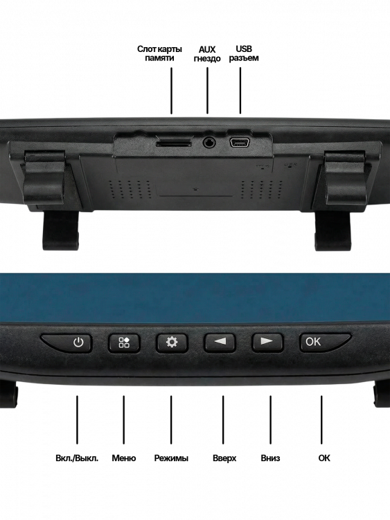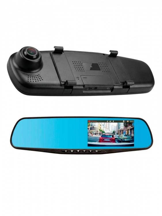 | видеорегистратор, кабель питания 1.5м, камера заднего вида, крепление на зеркало, инструкция на Русском |