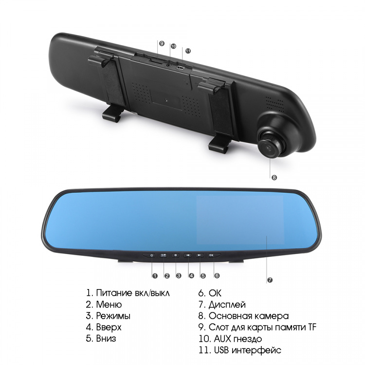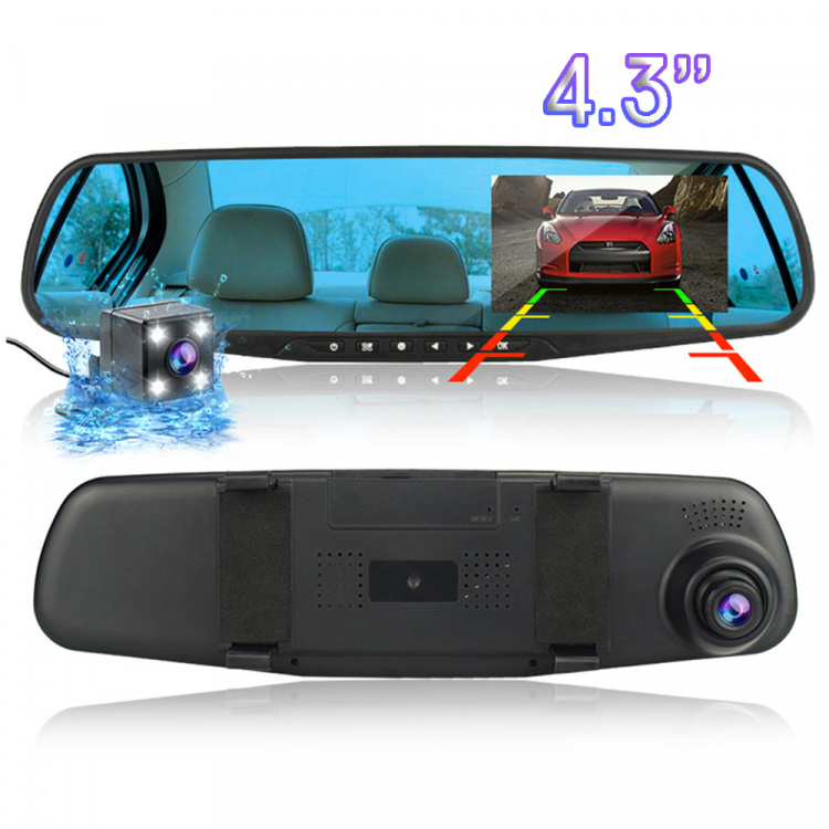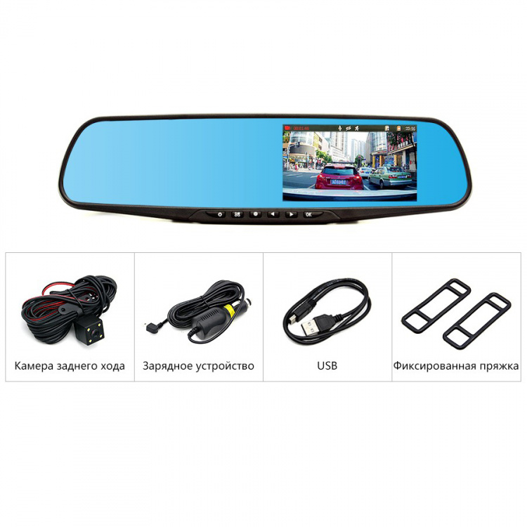 | видеорегистратор, кабель питания 1.5м, камера заднего вида, крепление на зеркало, инструкция на Русском |