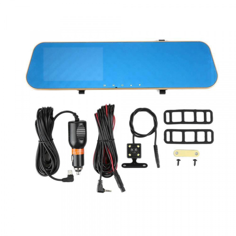 | видеорегистратор, кабель питания 1.5м, камера заднего вида, крепление на зеркало, инструкция на Русском |