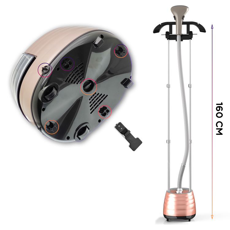 Съемный бачок изготовлен из пластмассы. Материал бачка достаточно прочный и не разобьется, если случайно уронить его на пол. Бачок имеет объем – 2500 мл, что позволяет использовать отпариватель непрерывно в течение долгого времени. Конструкция отпаривателя позволяет полностью сливать воду, благодаря двум сливным отверстиям из внутренней части прибора во избежание скопления несвежей воды и размножения бактерий.