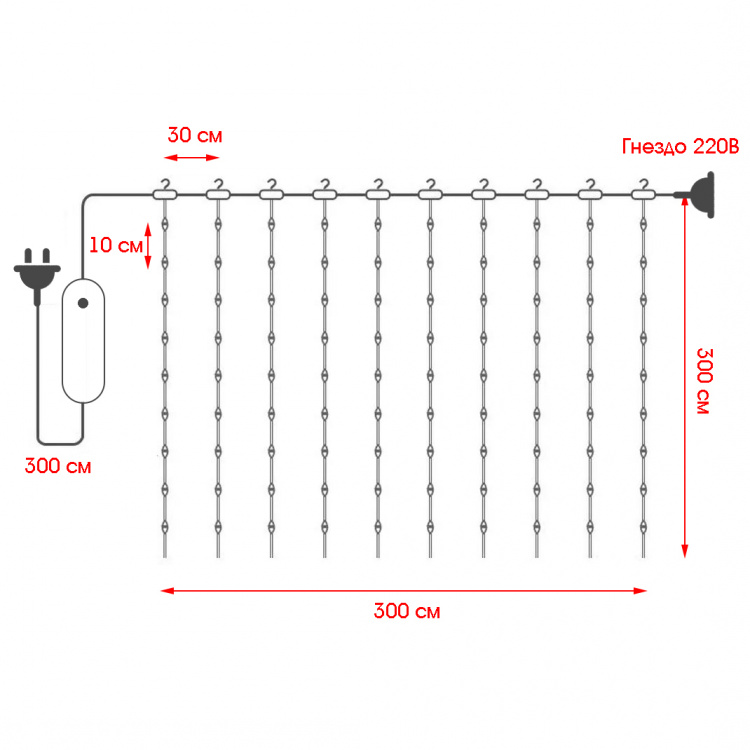 Количество цепей: 10шт по 30 светодиодов на каждой