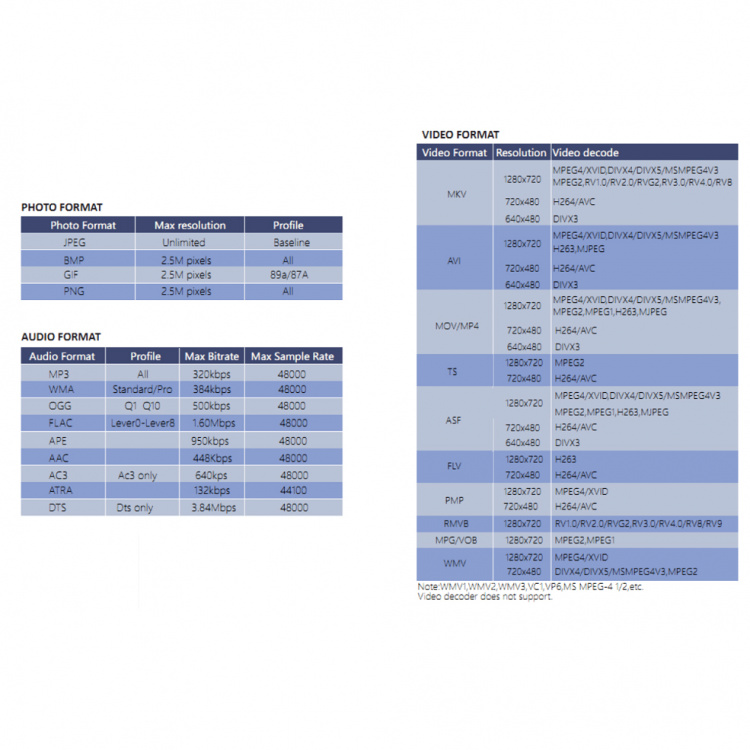 Более подробно с разрешением файлов и декодерами можно ознакомиться в инструкции!