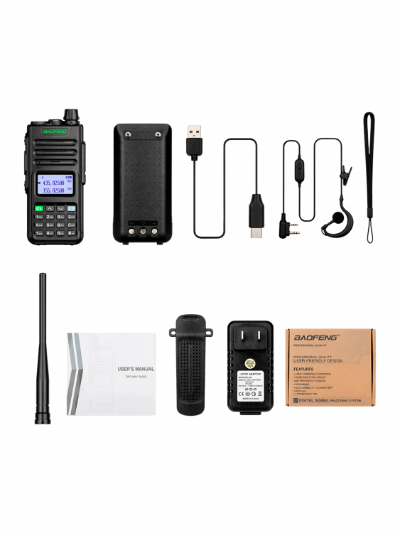| рация, антенна, клипса, шнур питания, ремешок, гарнитура, блок питания, инструкция на Английском |