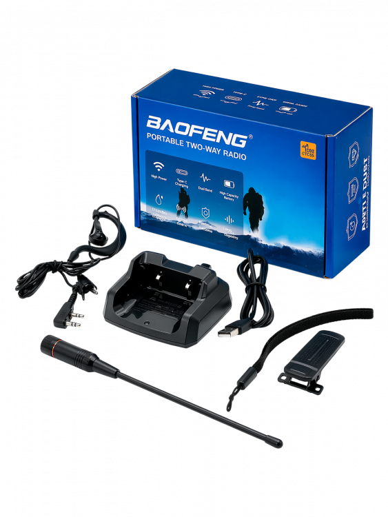 | рация, антенна, клипса, стакан для ЗУ, ремешок, гарнитура, блок питания, инструкция на Английском |