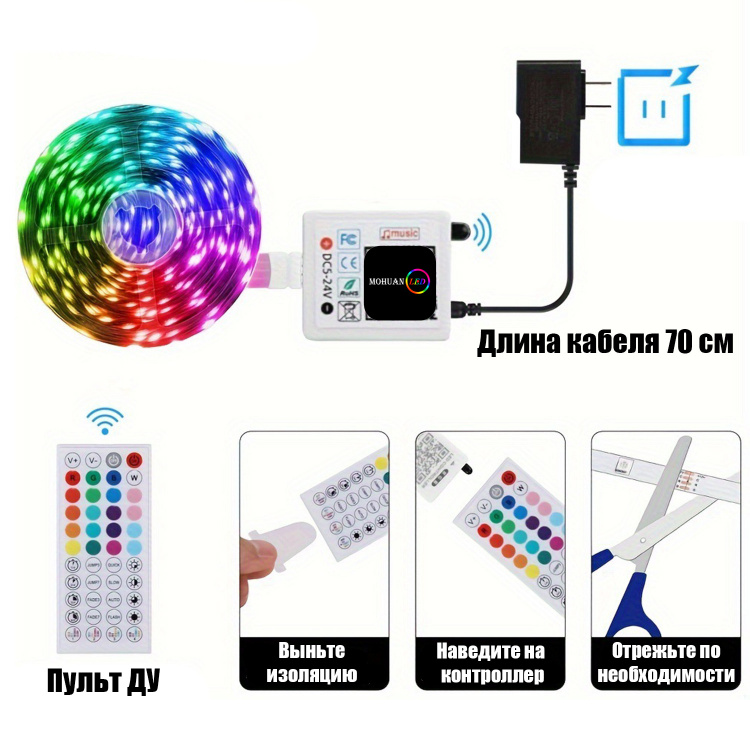 | Лента, контроллер 5-24В, пульт ДУ, блок питания, инструкция на Английском |